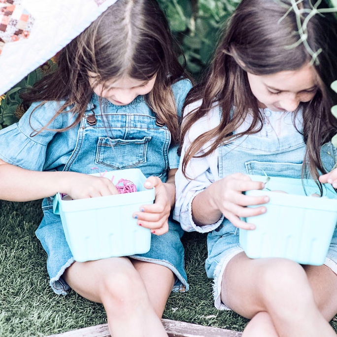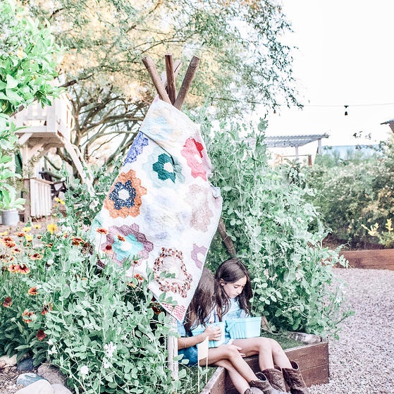 The Easter egg hunt ended at the girl’s bean teepee in their garden. We wrapped the teepee with an old quilt to add shade during the party.