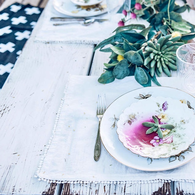 The table was set with my amazing collection of vintage dishes passed down from my family. On each plate my girls set the tops of real succulents cut from our garden.