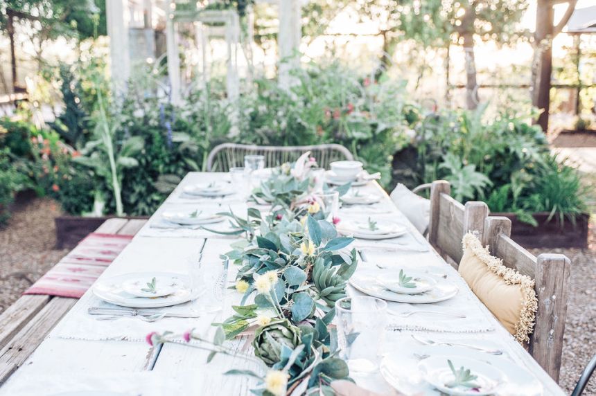 I paired my faux eucalyptus garland with faux succulents, artichokes and spring flowers for a gorgeous center piece down the middle of our outdoor farm table.