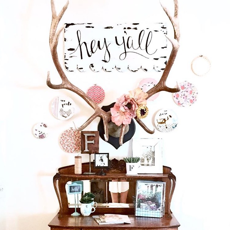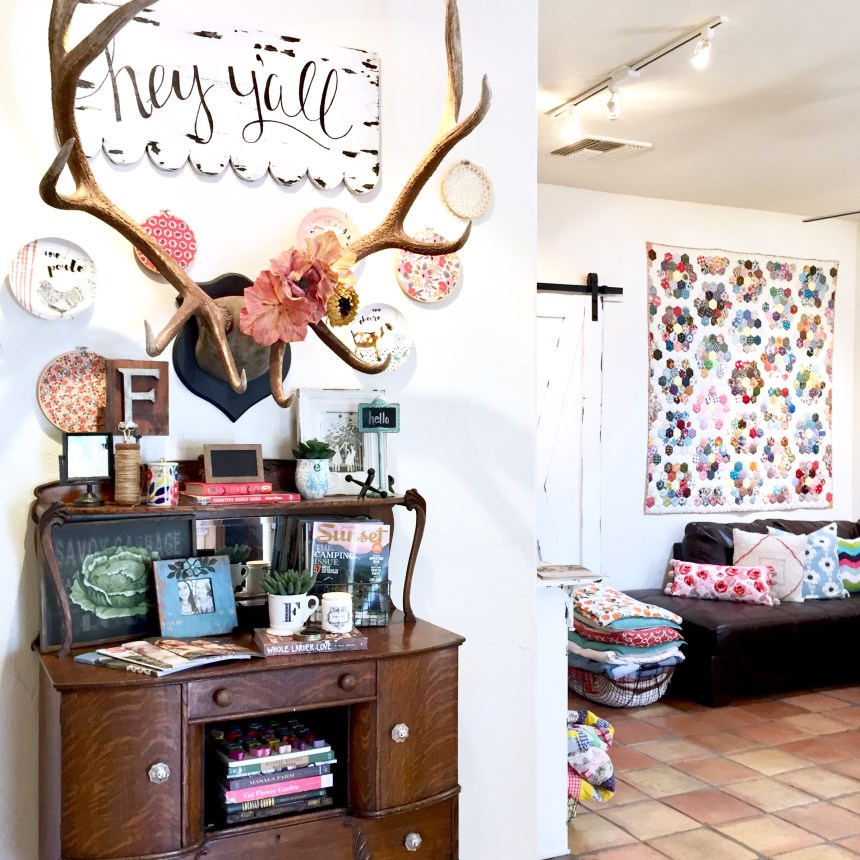 Hand sewn quilts on the wall, my husband’s elk {with flowers} and a vintage hutch set the playful eclectic vibe as you walk through the hacienda front doors. I also have a love for fabric and I have a bunch of sewing hoops with my favorite fabrics hung throughout the house.