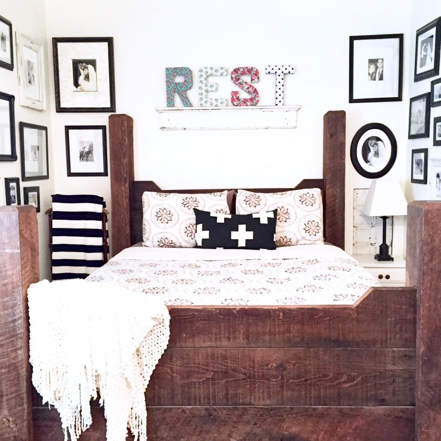 The Master bedroom is small but it just fits this amazing barn wood bed passed down from my family.