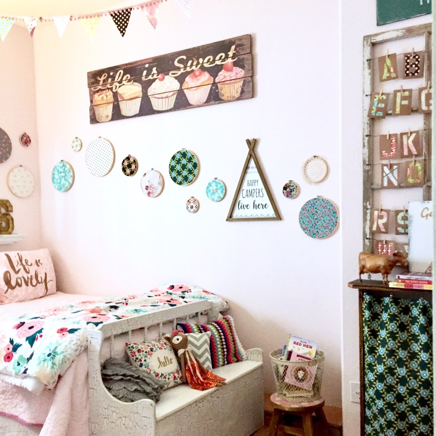 The girl’s room is so fun and sweet. Of course filled with more sewing hoops and lots of books and pillows. They are begging for bunk beds, so if that happens I will post the transformation here!