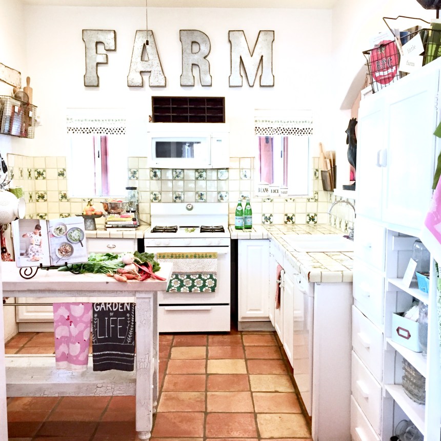 This is our kitchen and I love our little kitchen. Luckily the hacienda vibe was already here when we moved in. I just painted the walls and the cabinets white and of course added a huge FARM sign so that ya’ll would know this is a farmhouse!